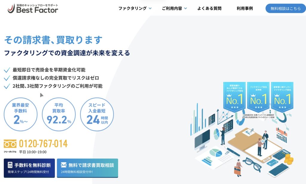 | ベストファクター | 2%〜20% | 30万〜1億円 | 最短即日 | 法人/個人事業主 |