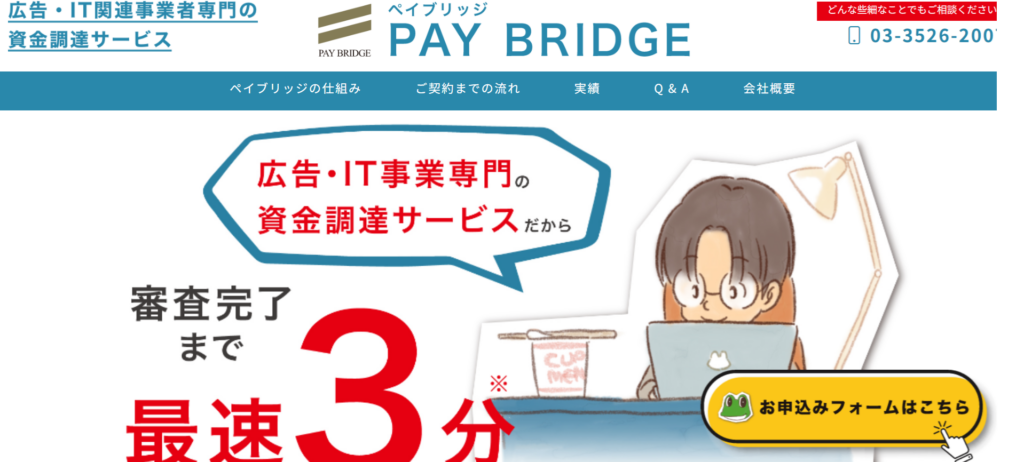 ファクタリング会社です。とにかく申し込みから入金までのスピードが早く、他社では断られがちな30万円~の少額取引が可能なのも魅力です!